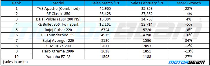 Royal Enfield dominates the sales with 3 of its bikes coming in the top 10 list of best sellers for the month of March.