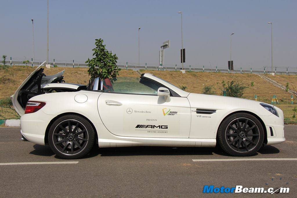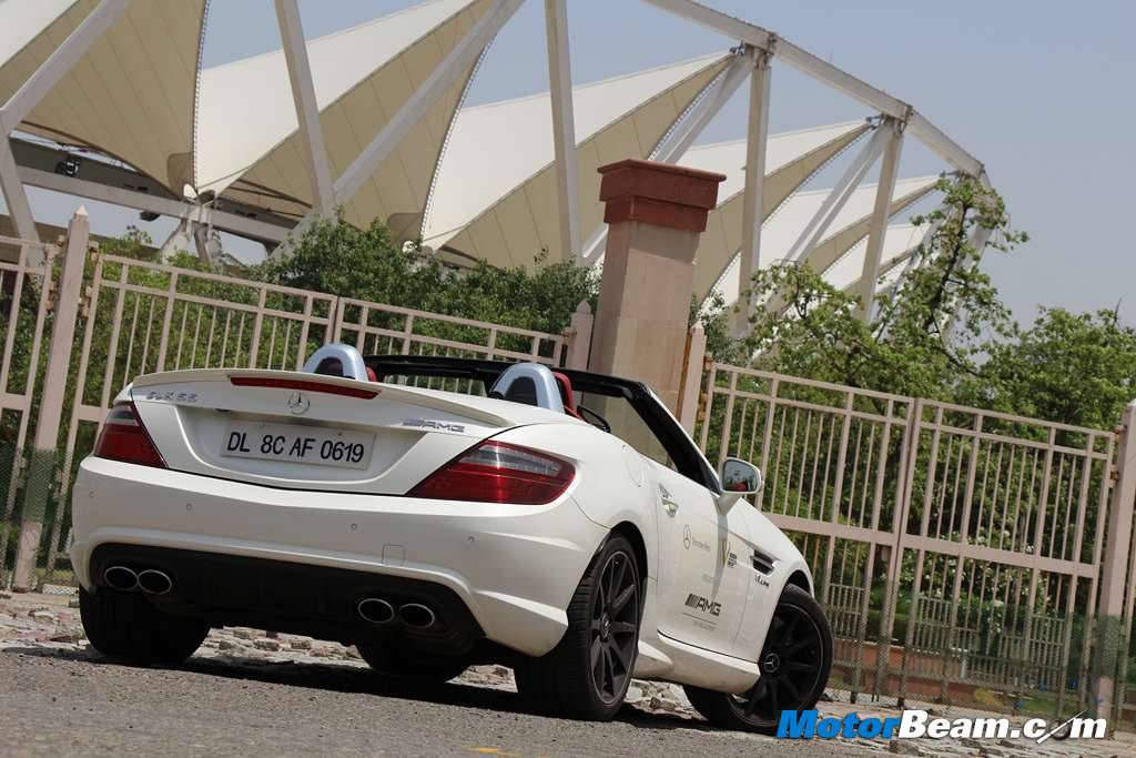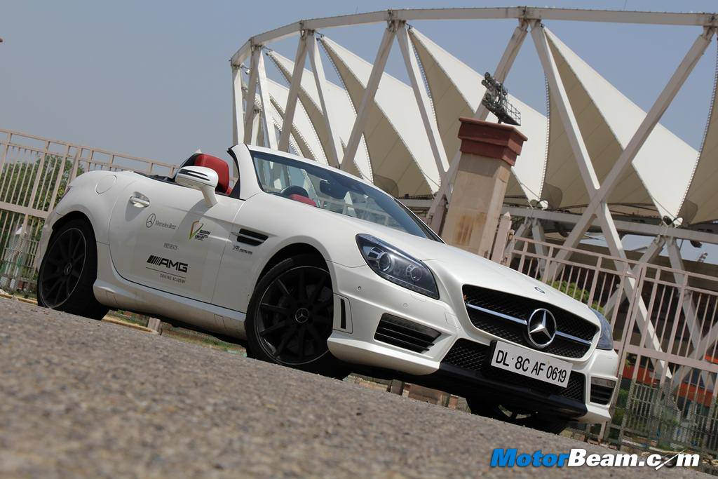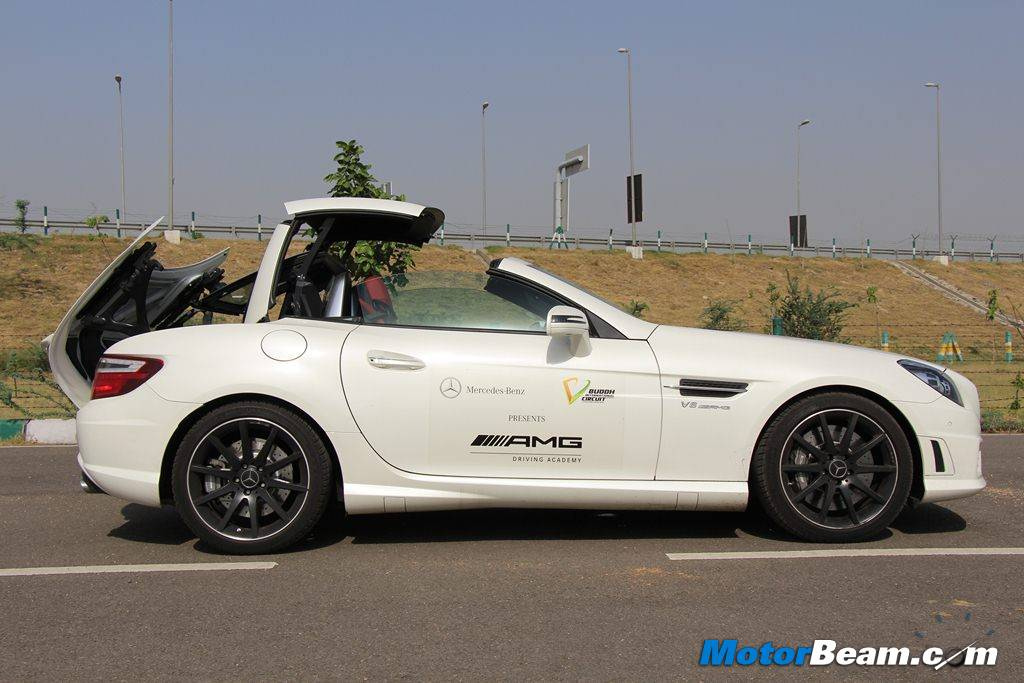 Exteriors – The Mercedes SLK 55 AMG gets some spruced up racy exterior styling cues to differentiate itself from the regular Mercedes SLK 350. The front profile reveals a smoked headlamp cluster with a revised front bumper featuring a larger airdam and repositioned LED daytime running lights. You can notice the compact size of the SLK from the side profile. It gets black alloy wheels that make a good contrast with the white colour and more pronounced side skirts. The V8 AMG badging can be noticed on the front fenders.