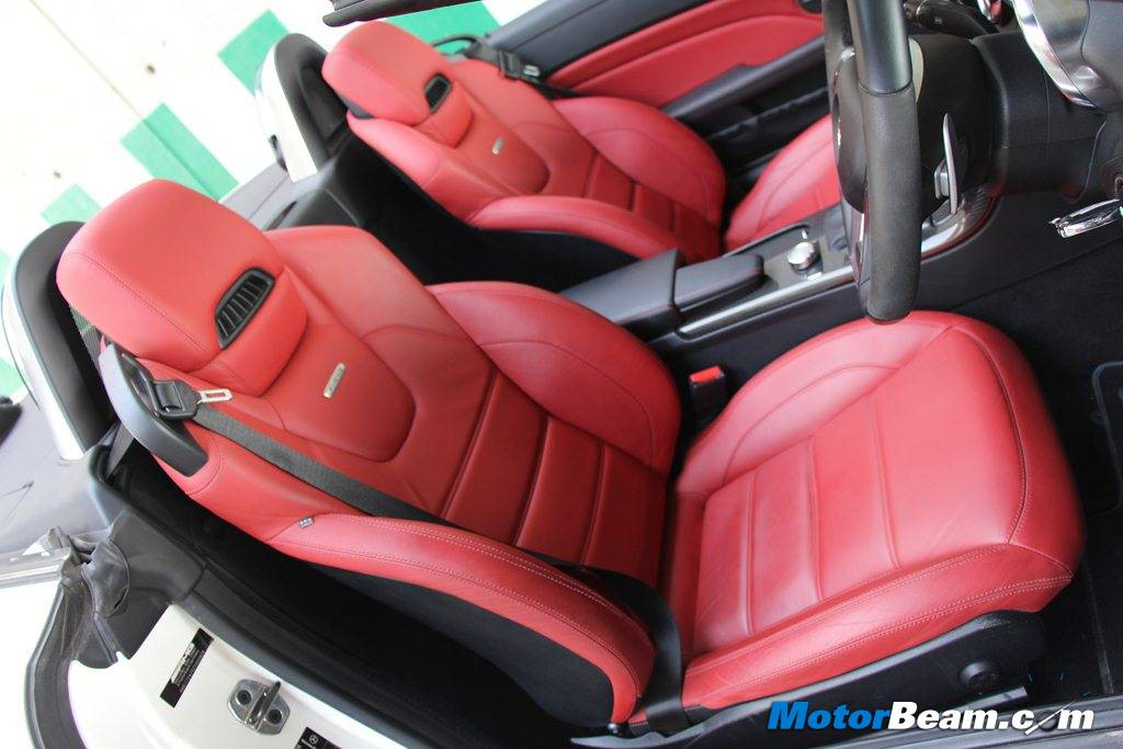 Interiors – The Mercedes SLK 55 AMG is a low slung car and you have to crouch down to get inside. Once you are inside, the roadster pampers you with a cocooned layout and superb quality interiors. First thing you notice is the AMG flat-bottom steering wheel that feels incredible to hold with supportive contours. The interior styling is derived from its godfather, the Mercedes SLS AMG that includes recessed black dashboard styling with circular AC vents and sporty red colour treatment on the seats and door trims. The layout remains the same as the regular SLK but you’ll find carbon-fibre trims on the centre console and doors of the SLK 55 AMG compared to the brushed silver trims of the regular model.