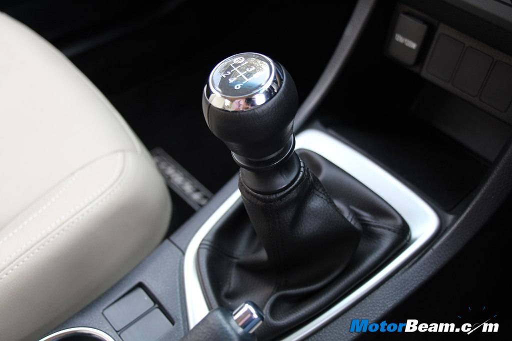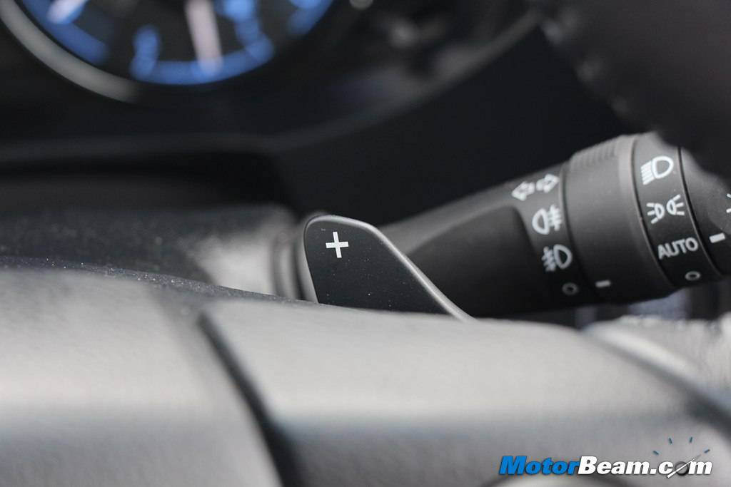 Interiors – Step inside the cabin and you’ll be surprised again by the distinctive ‘out of the box’ styling of the dashboard. The dual tone layout involves three different layers that look chic. There is a mix of black, beige and silver along with a carbon-fibre inspired panel for the centre console. The three-spoke contoured steering feels good to hold, having a brushed aluminium finish at the bottom and paddle shifts on the automatic version. The wheel has reach and rake manual adjustment. The steering mounted buttons are ergonomically placed and there is a cruise control stalk mounted behind the wheel, on the column. Instrument cluster is very neatly done with simple yet stylish layout. Two chrome pods are placed on either side of the MID for tachometer and speedometer with analogue fuel and temperature gauge. The blue illumination and theme of the console is sober and not in-your-face, so it’s easy to read. The MID shows all the necessary information including outside temperature, gear selection, fuel info, trip, etc. Quality of the materials feel rich and well screwed together, putting a tough fight to the competition.
