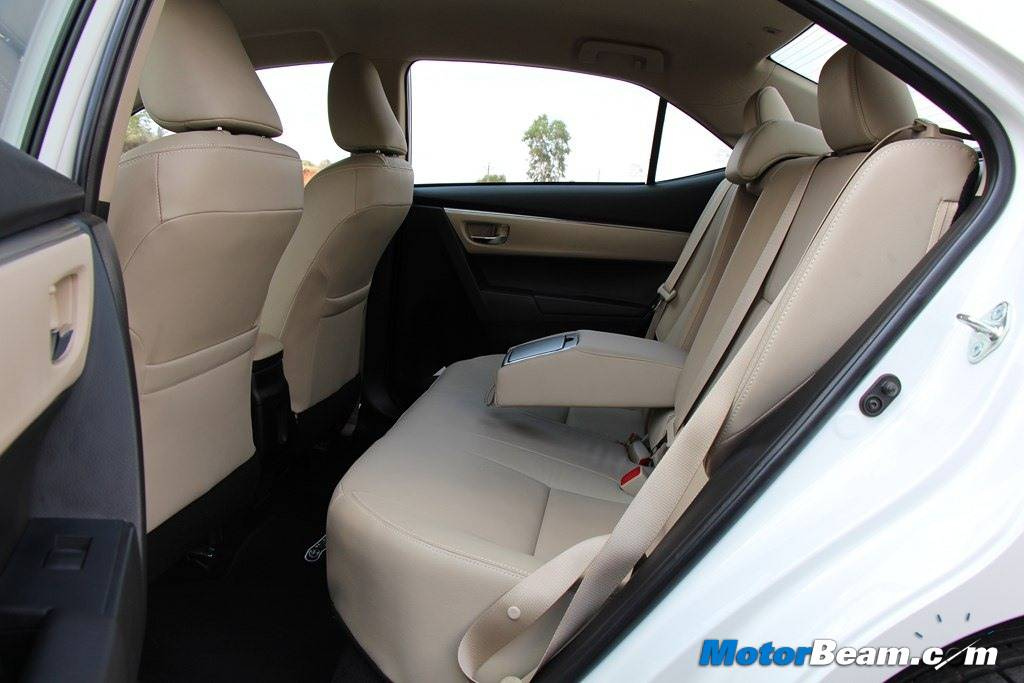 The driver’s foot-well is wide and gets a big dead pedal for additional comfort. The seats are supportive and cozy. While the front passenger seat is manually adjustable, the driver gets eight-way electronically adjustable seats with lumbar support and good flexibility. The additional 100 mm of wheelbase on the new Toyota Corolla Altis is evident at the rear. There is ample amount of legroom for rear passengers with an almost non-existent floor hump, so three people can sit easily. Headroom and shoulder room would also be appreciated in the new Corolla. There is good all-round support with well cushioned seats and a wide arm-rest with cup-holders. The rear seats are reclinable too and there is a power socket for rear passengers. Enough storage space is provided including deep glovebox and cup, bottle and sunglass holders. Boot is accommodating at 470-litres and there is a full-size spare alloy wheel underneath. Rear seats have 60:40 split for additional cargo space. Other convenient features include auto headlamps, rain sensing wipers, smart key and driver side one touch up/down mirrors.