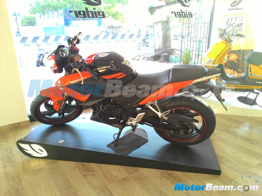 Eider Motors is a newly formed two-wheeler company from the newly formed state of Telangana that is slowly and steadily expanding its base across the country. With its presence in Tamil Nadu, Karnataka and home market Telangana, Eider recently opened its first dealership in Maharashtra at Ulhasnagar near Mumbai. While the home-grown bike maker’s showrooms currently have five products on display ranging from 125cc to 150cc, our reader Julian Bennet paid a visit to the Eider showroom in Chennai recently and spotted a new 250cc street-fighter offering put up on display.