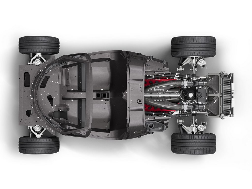 Ferrari has ensured that the car has a weight distribution split of 44 percent front and 56 percent rear and has equipped it with wide tyres – 265/30-R20 front, 345/30-R21 rear – and large brakes.