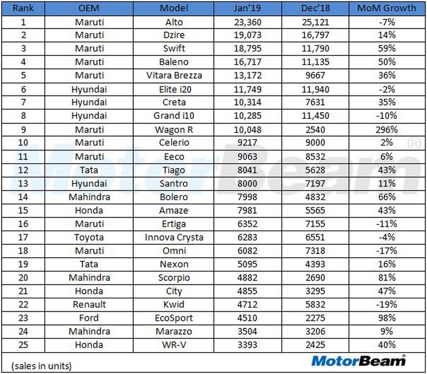 The Maruti Alto remains first, Wagon R makes a tremendous growth to come in top 10.