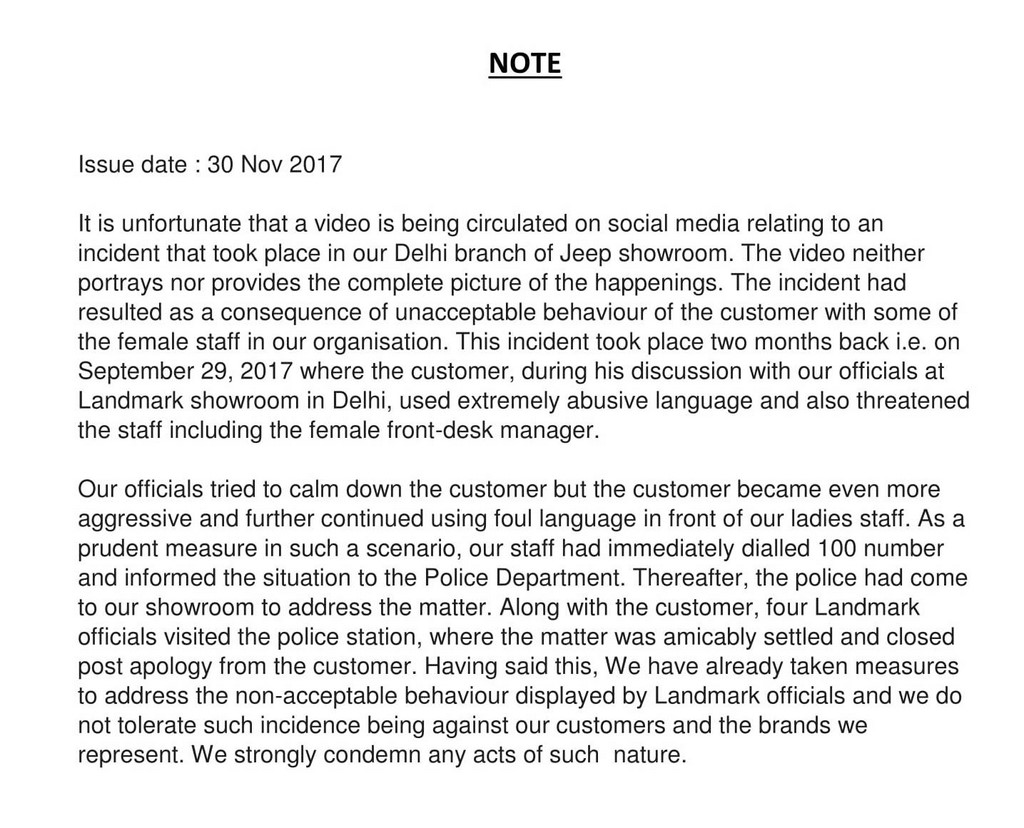The Landmark Group has also issued a statement explaining their side of the story and according to the statement, the incident had occurred on 29th September 2017. The customer had used foul language during his discussion with the showroom staff and threatened the staff including the female front-desk manager. The more the officials tried to calm down the customer, the more aggressive he got and continued using foul language. The staff then contacted the local police who visited the showroom and heard from both the parties. The customer along with four staff members from the dealership visited the police station where the whole matter was settled and closed after receiving an apology from the customer.