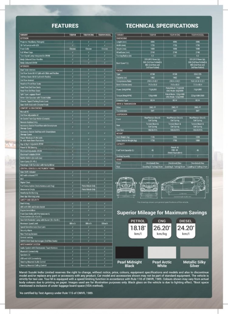 In terms of safety, the Maruti Tour M comes with dual front airbags, ABS, EBD, Brake Assist, Speed Warning and reverse parking sensors as standard. Only three colour options are available for the Tour M including white, black and silver.