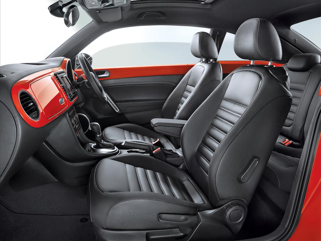 The new generation Volkswagen Beetle has also grown mature inside the cabin with a more sobered up dashboard and has done away with the flower vase for good this time. A flat-bottom steering wheel induces some sportiness while the dash gets an exterior matching paint job. The entire cabin is finished in black otherwise with the Vienna upholstered seats. Also very cool are the mood lighting on front speaker surround (3 colours), leather wrapped handbrake, steering and gearshift knob; scuff plates and chrome trim rotary light switch.