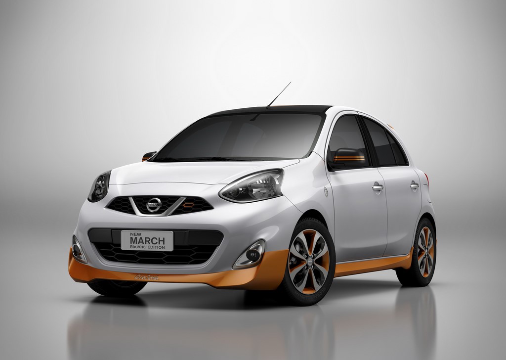 Nissan with its Micra surely goes places as it is one of the most famous models around the world in the hatchback segment like how the GTR is in the supercar segment. Nissan is now the global partner of the 2016 Olympic and Paralympic Games that will be held in Rio de Janeiro. Nissan March, the name of the car in Brazil has been spruced up as limited edition to support the games that are being held in Rio. This special vehicle was designed by Nissan Design America Rio studio which was opened this year. The car features special details such as the white and gold paint scheme, with the colour gold being seen on the rear-view mirrors, side skirts, wheels, spoiler and roof. The logo of the 2016 Olympics is featured on the car’s rear and front fenders and on the boot lid. The specially done alloy wheels seem to be one of the most eye catching part of this Micra.
