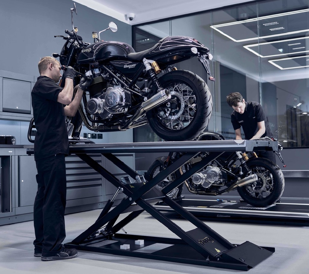 The showroom features Norton bikes under spotlight, surrounded by the brand’s heritage bikes and prints of racing icons on the walls.
