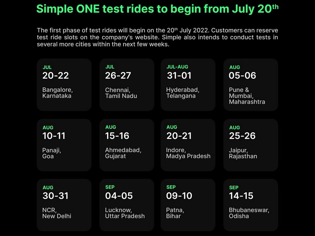 Simple One test rides will start from 20th July and end on 15th September, deliveries will begin from September