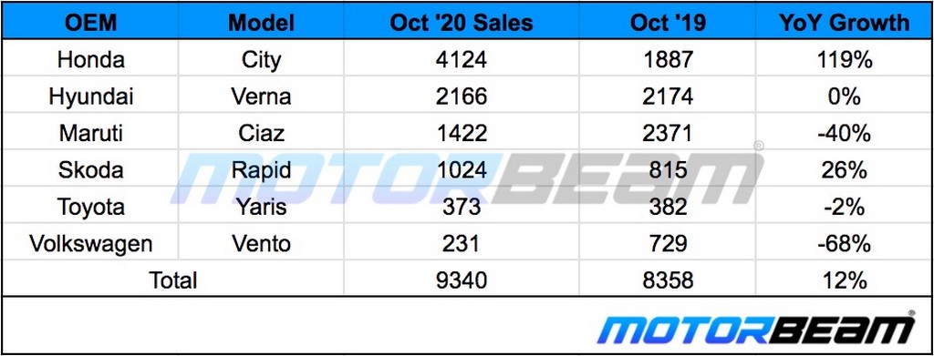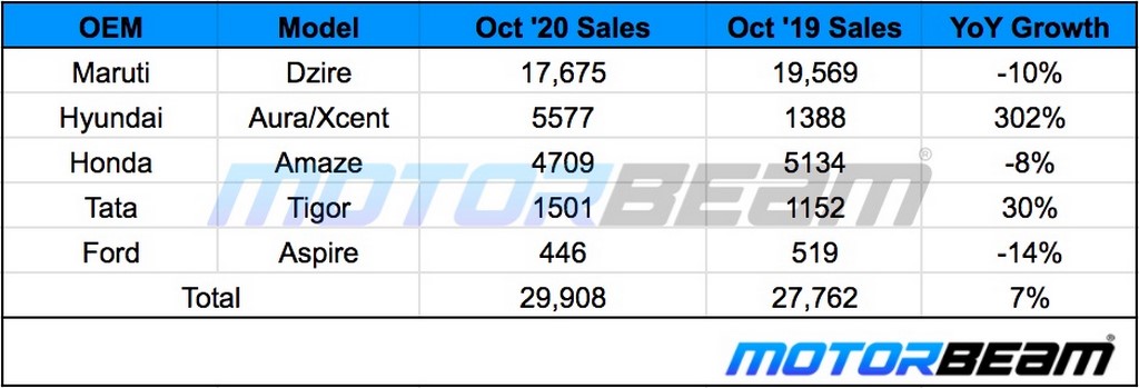 When it comes to the October 2020 sedan sales, Maruti Suzuki Dzire leads the compact sedan segment.