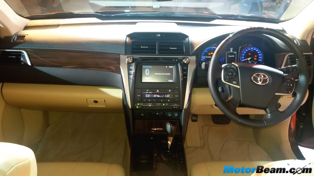 Interiors – On the inside, the 2015 Camry facelift has retained the layout from the outgoing model but sports a revised multi-function steering wheel, new 6.1-inch display screen and a 4.2-inch TFT screen on the instrument console. The upholstery has been revised and is available in beige. The car continues to offer ample of legroom and a plush ride quality for the passengers.