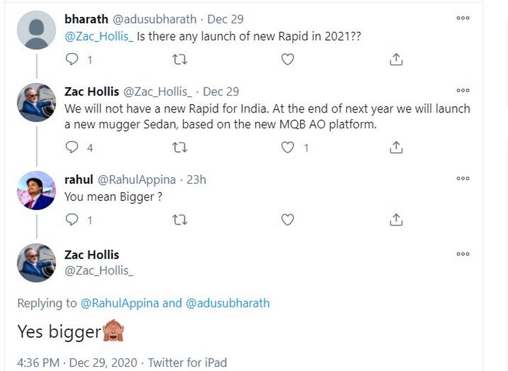 However, there is a slight twist to the tale. Replying to a query on Twitter yesterday, Director (Sales, Service and Marketing) of Skoda Auto India, Zac Hollis, has stated that there will be no new Rapid for India.