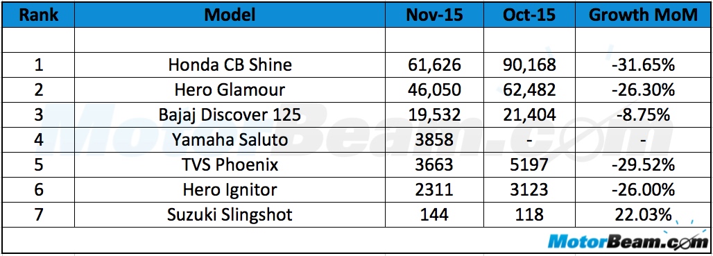 The sales report for November 2015 was disappointing in the 125cc and 150cc segments with only the newly launched Bajaj Avenger 150 making its presence felt with healthy numbers.