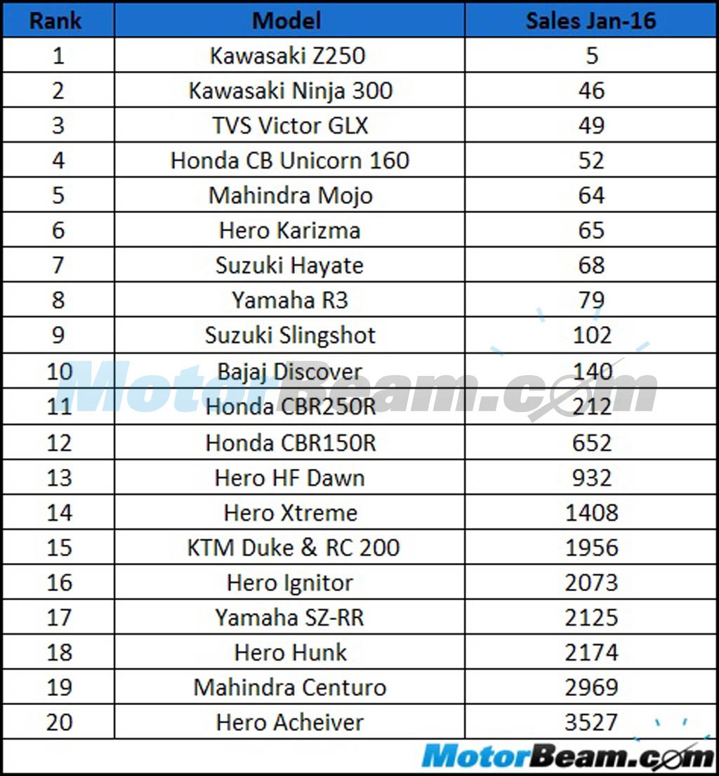 There were a number of bikes such as the Hero Impulse and TVS Star City 125 which were not even able to open their sales, however, we decided to focus on the ones that at least started their sales. The top scorer is the Kawasaki Z250 with just 5 units in January while runner-up is the Ninja 300 with 46 units.