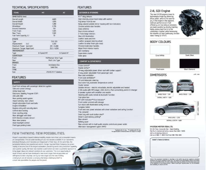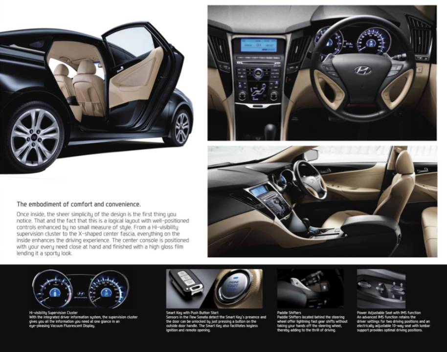 Under the hood, the Sonata Fluidic gets a 2.4 litre GDi engine that produces 201 BHP of power at 6300 RPM and 25.5 kgm of torque at 4250 RPM. The engine is mated to a 6 speed manual or a 6 speed automatic gearbox unit. The Sonata gets loads of safety features like Dual Front Airbags, side and curtain airbags, ESP, ABS with EBD, rear parking assist, impact sensing door unlock, rear view camera and auto headlight control. On the interior, the Sonata gets 2 tone beige interiors with blue LED illumination of cabin, leather wrapped steering wheel and wooden inserts on the interiors. With loads of features, space and appeal, this car is sure to take on its rivals very well, if only Hyundai can price it strategically. The Sonata is expected to be launched in the first week of March.
