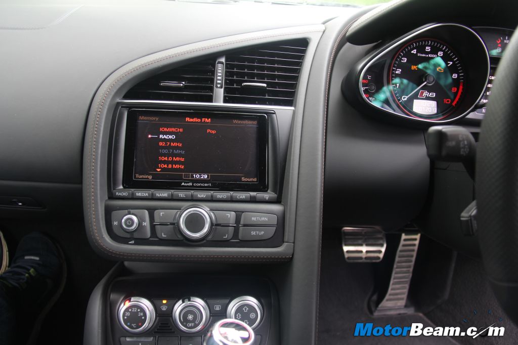 Interiors – Open the long and frameless door and you might find it a bit difficult to get inside the first time. The Audi R8 is a very low slung car which means you have to really bend to get in. This is a normal ritual with any supercar so nothing to really complain about. The interiors are very Audi-like which means you will see many design elements seen on other Audi vehicles. This is a good and bad thing. Good because quality is top class and everything feels so robust and luxurious that you tend to feel you are in a luxury car more than a sports car. The visible stitching on the dashboard is very neatly executed. Bad thing is the lack of exclusivity and for a car of this tech wizardry, Audi should have offered a button start/stop for turning on the engine. You instead get a flip key with a regular turn on/off mechanism.