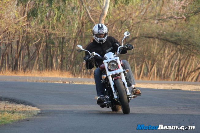 There is so much power on tap, that the Hyosung GV650 doesn’t feel out of breath till upper three digit speeds. It continues to pull strongly and boasts of a top speed of 195 km/hr. 0 – 100 km/hr comes up in just 6 seconds, while the 140 km/hr mark is done in just 11 seconds. The GV650 transfers power to the rear wheels via a belt and uses a 5-speed gearbox, which has different ratios than the GT650R. However the first gear seems to be the same as that of the GT650R and we could hit 87 km/hr in first gear, post which the revv-limiter kicked in. Make no mistake, the GV650 is a cruiser but can still give you a hair raising experience.