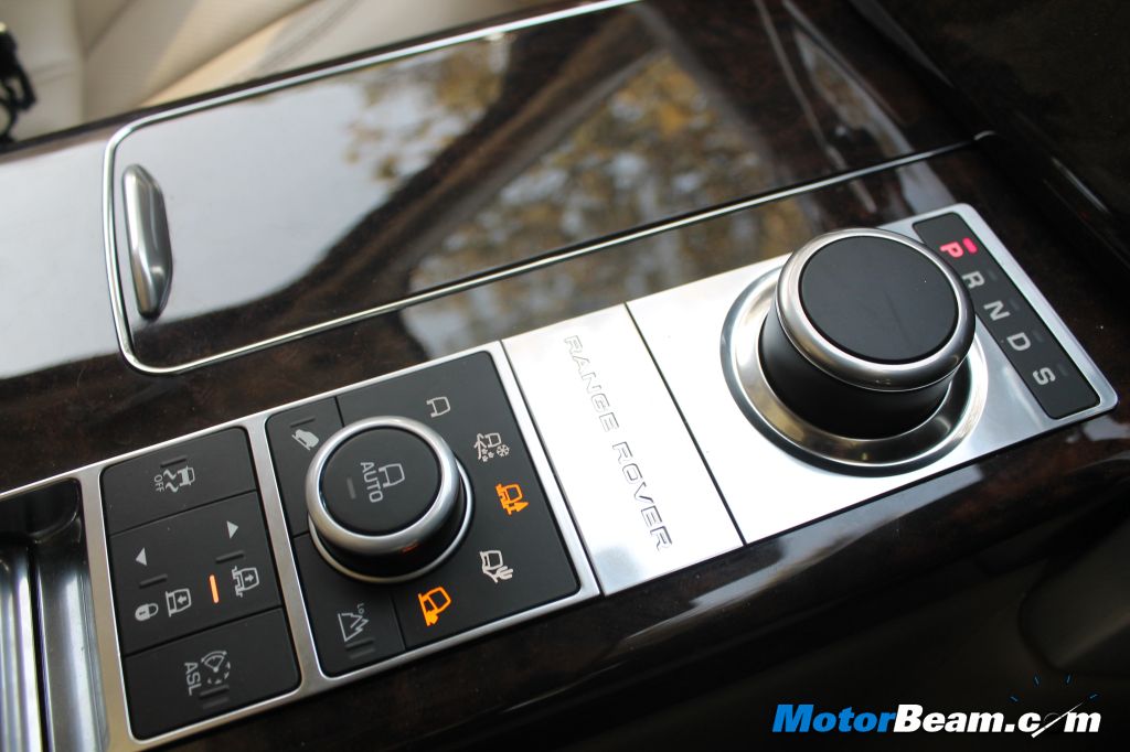 The dashboard now features a clean layout with drastically reduced buttons over its predecessor. The large steering wheel houses buttons to utilize in car functions and the seats are positioned perfectly to give easy access to all controls. The instrument cluster is completely digital and has white dials with blue rings. It is extremely easy on the eyes and is quite high tech with plethora of car functions embedded into it. Some styling cues come from the Evoque, like the touch screen unit which works perfectly. The navigation maps on the vehicle don’t seem to work well in Indian environment though. The 8-inch display is highly rich in content and carries an array of data, including various performance metrics and all around cameras (Surround Camera System). The centre console is clean and features brushed aluminium pillars on each side of the centre stack with the rising gear knob, Range Rover badging, Terrain Response System controls and storage bay in between the front seats.