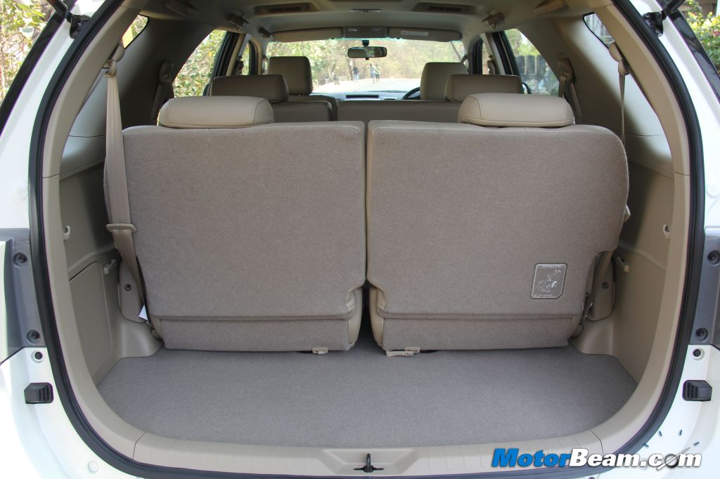 The air-conditioner chills in an instant but we don’t like the placement of the switch which activates the rear blowers. The Toyota Fortuner offers good comfort for front passengers with the right bit of padding to ensure long drivers are tireless. Getting in and out is easy too thanks to the running board and holding handles placed near every door. The vehicle is a 7-seater and the second row offers very good legroom and thigh support but lacks on the headroom front. The last row lacks legroom though and is best suited for kids. The boot is decently big and can carry two large suitcases without having to drop the last row of seats.