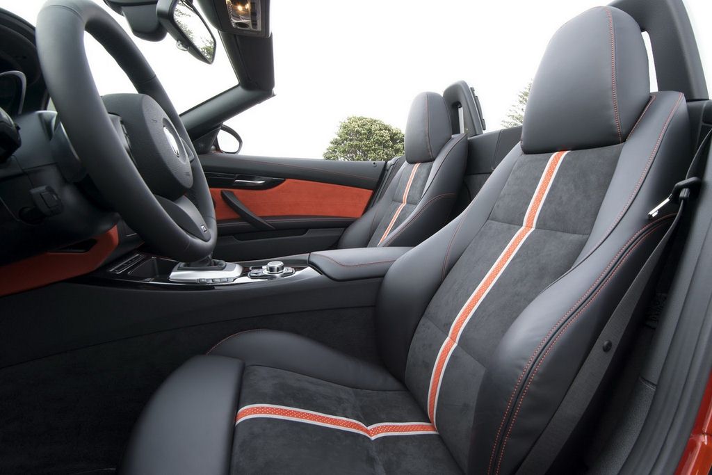 What this pack includes is the whole interior is covered with black leather and Alcantara with orange stripes on the dashboard, special orange stitching and orange door panels. Also this package has a metal weave trim for the dash and high gloss black for other trim pieces like the door openers and gear lever. Most other things are the same with the standard iDrive system that folds into the dash as well as many new trims as well as upholstery options. A new navigation system using the same folding screen of the iDrive is available as an option.