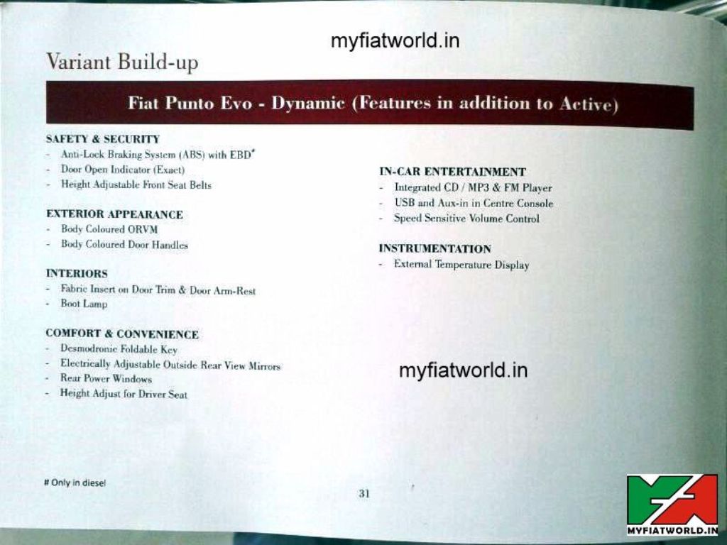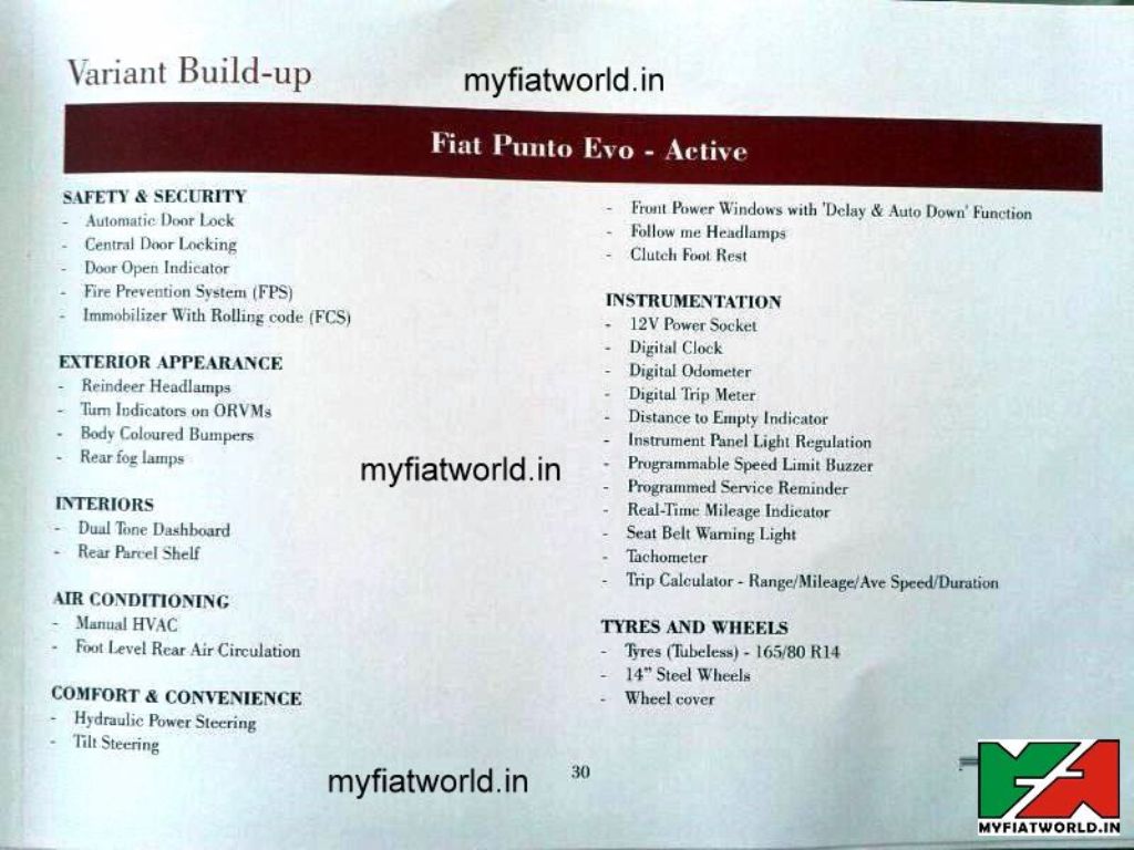All set to make a comeback in the premium hatchback space, Fiat India has comprehensively worked on the 2014 Punto facelift christened as the ‘Punto Evo’ that will be make its debut in the coming weeks. Now, the brochure of the 2014 Punto has leaked online revealing the variants, engine options as well as the new set of features available on the hatchback. The Punto Evo will be available in four variants namely Active, Dynamic, Emotion and Sports trims (same as the outgoing model); while engine options remain unchanged as well.