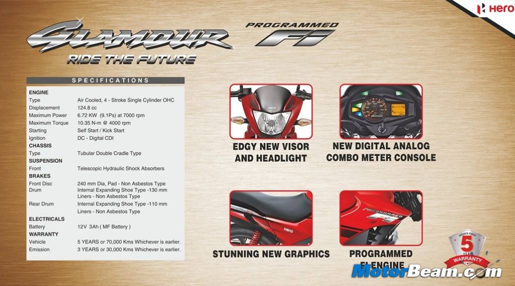 The 2014 Hero Glamour and its fuel injected version get updated with new paint job and body graphics. Along with the cosmetic upgrades, the manufacturer has redesigned the dials on the instrument cluster for a fresher look. The tech specs of the bike remain untouched. The Hero Glamour is powered by an air-cooled, 124.8 cc 4-stroke, single-cylinder OHC engine which produces a maximum power output of 9 BHP at 7000 RPM and 10.35 Nm of peak torque at 4000 RPM, mated to a 4-speed transmission.