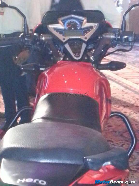 More pictures of the facelifted Hero Xtreme have reached us and there are a slew of updates which can be seen over the previous pictures which only displayed the front. The complete motorcycle shows a lot more change. Immediately noticeable is the new fatter rear tyre, new open chain case and the raised tail section which looks exactly like the one seen on the spied Karizma ZMR. The rear section seems to be inspired by EBR’s 1190 superbike.