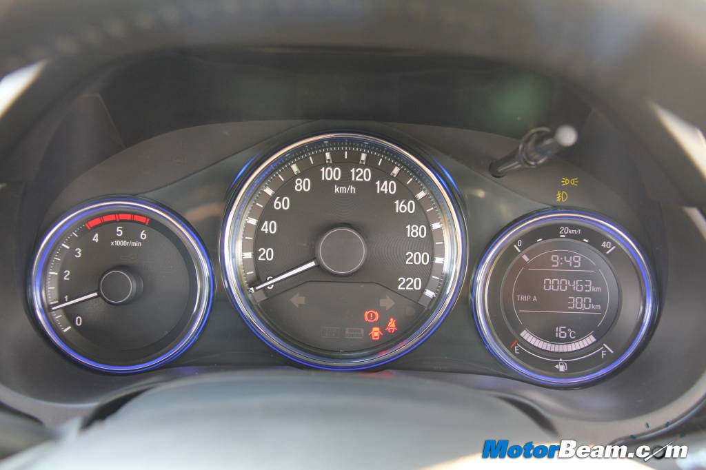 Honda continues to offer an automatic gearbox with the petrol City but the traditional torque converter AT has been ditched for a 7-step CVT unit which offers higher efficiency than even the manual version. ARAI mileage is 18 km/l and there is an ECON button on the right side of the steering column. The CVT box is noisy but not as noisy as other CVT equipped cars in the segment. If you are not driving with the throttle pinned to the floor, the noise isn’t too much either. On full pelt, the revs drop to 4500 RPM in each step after hitting redline. Yes, it does rob away the fun you have with the manual City as the CVT box makes the car slower and also less involving to drive. However for those who want a hassle-free driving experience, the CVT unit ticks the right boxes and comes across as an excellent alternative for relaxed driving. You do have paddle shifts on the steering wheel and the option of choosing Sport mode on the transmission. 100 km/hr in 7th step sees the RPM needle tick in at 2400 RPM while during outright acceleration, the ton is achieved in third step. The CVT model also gets Hill Hold function. All models come with ambient meter rings which are blue in regular driving and turn green when you drive efficiently (looks cooler than the ECO text on the Brio).
