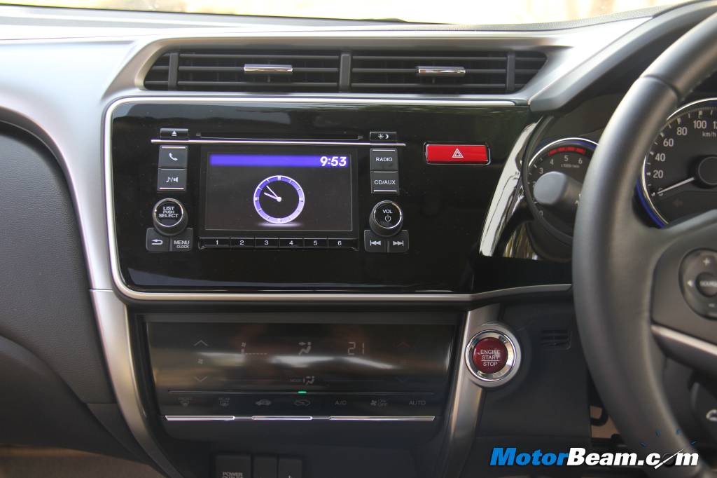 Interiors – The interiors of the new Honda City could pass off as a revolution. The dashboard which Honda calls ‘layered floating cockpit’ comes from the Jazz and is an attractive unit with excellent quality all around (good plastics, fit and finish but again not in the same league as its European rivals). The all black dash gets silver accents and piano black treatment in the form of gloss finish which looks very premium but easily catches fingerprints. The centre AC vents are a bit small but equally functional and the centre console is tilted towards the driver. The steering wheel has ergonomically placed buttons. There are plenty of storage spaces inside the cabin (including a toll receipt holder below the headlight leveller) and Honda has given the new City four power outlets (2 at the front and 2 at the rear) which is quite handy these days. The 5-inch infotainment system gets all sorts of connectivity options (including AUX, USB, iPod and Bluetooth) and also doubles up as a reverse camera display (there are three views – Wide, Normal and Top Down).