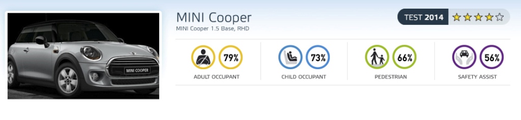 The 2015 MINI scored a 4 star rating in the Euro NCAP achieving 79% in adult protection, 73% in child protection and 56% in pedestrian protection.