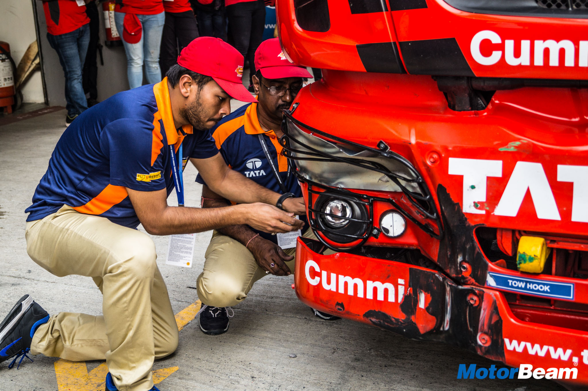 The racing slicks are supplied by JK Tyre. Each truck gets an 80-litre fuel tank and a full tank lasts for an average of 12 laps during a race is what we were told. Tata technicians were working on the trucks before the race and making sure everything was going well. Even in-between races, whatever damages or issues cropped up in trucks were immediately worked upon by the technicians and it was amazing to see the speed and enthusiasm with which all of them were working.