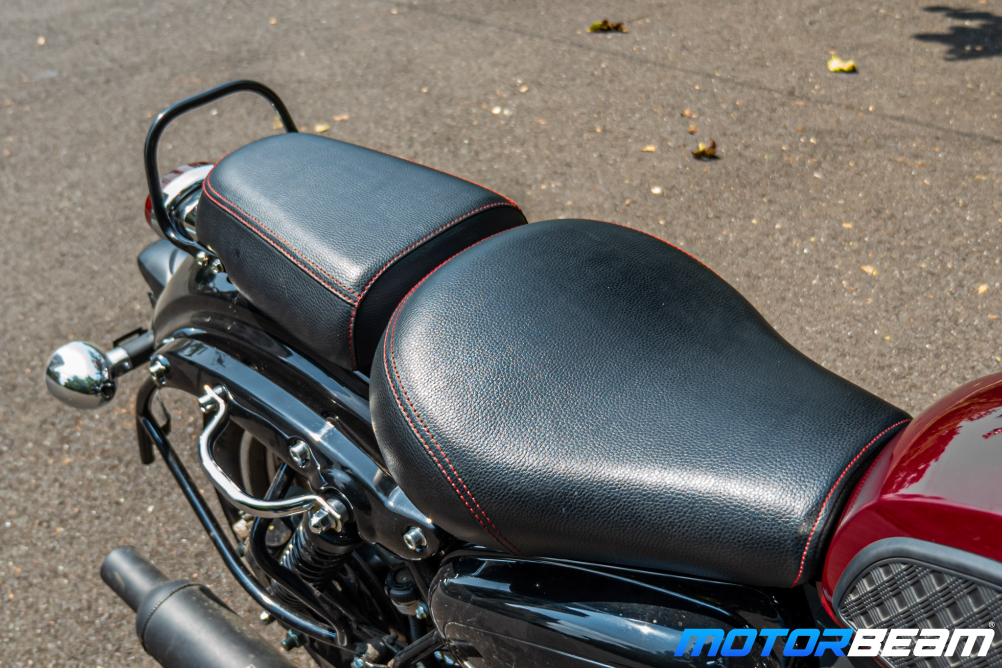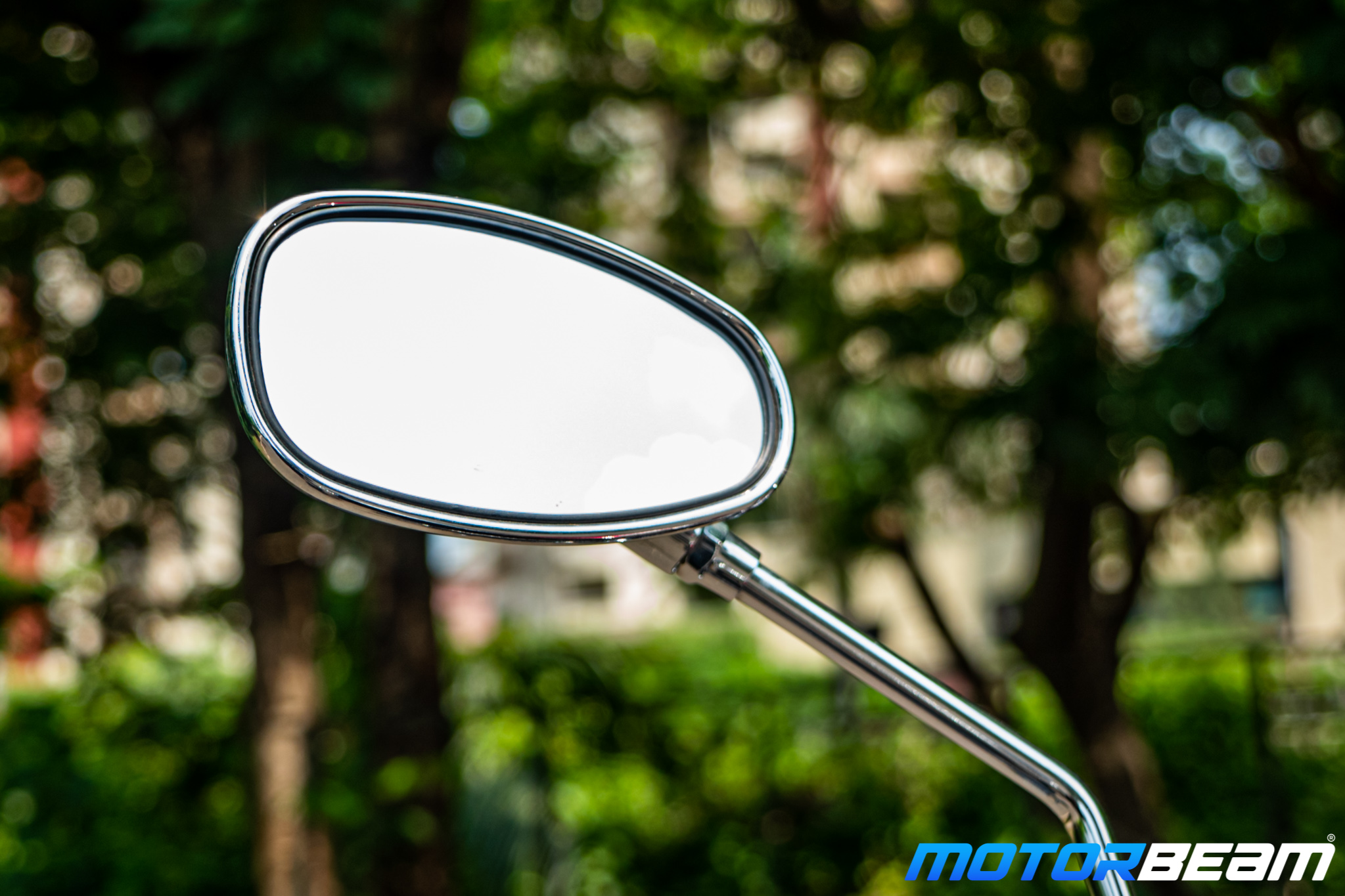 Ergonomics: The Benelli Imperiale 400, like any other retro bike, aims at comfortable ergonomics and it’s pretty good at it. The posture is upright and comfortable, thanks to the low seat height of 780 mm, wide handlebars and the centre-set footpegs. This gives the rider a commanding poise while riding. The fuel tank has rubber grips to aid the rider grip on while riding, but they’re not that purposeful. Additionally, the handlebars are a little far stretched and some riders might find it a little hard to get used to. The split-seat setup has good cushioning and is suitable for commuting and even for occasional touring. However, the pillion seat is on the shorter side. Lastly, the oval-shaped mirrors boast of a classic design and are purposeful as they offer a decent field of view.