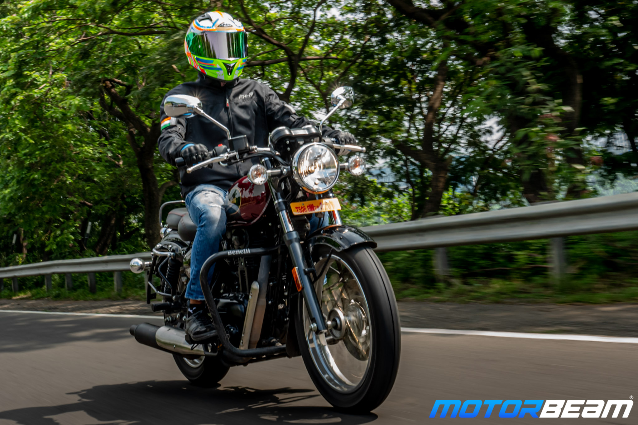 Moving on, a single 300 mm disc upfront and a 240 mm disc brake at the rear perform the braking duties. In addition, the bike also gets a dual-channel ABS built by Benelli in-house to ensure safety. The feedback from the brakes is progressive but lacks initial bite. However, the brakes perform adequately and we don’t have any issues with them. Further, the bike gets MRF tyres which offer decent grip but the grip levels can surely be better even though they are still thicker than the competition. To summarise, the Benelli Imperiale 400 offers comfortable riding dynamics and rounds up as a dutiful retro cruiser bike.