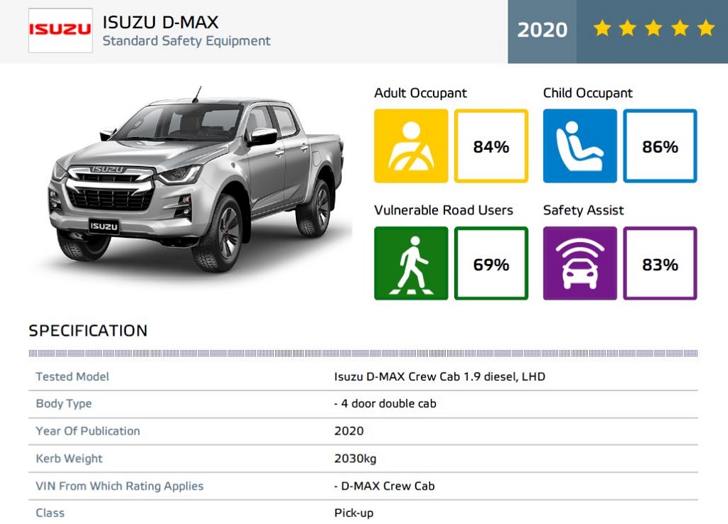 Earlier this year, the Isuzu D-MAX was rated by Australasian NCAP (ANCAP) and some tests have been repeated by Euro NCAP to ensure a valid rating for the European market. Other results have been carried over from the ANCAP tests.
