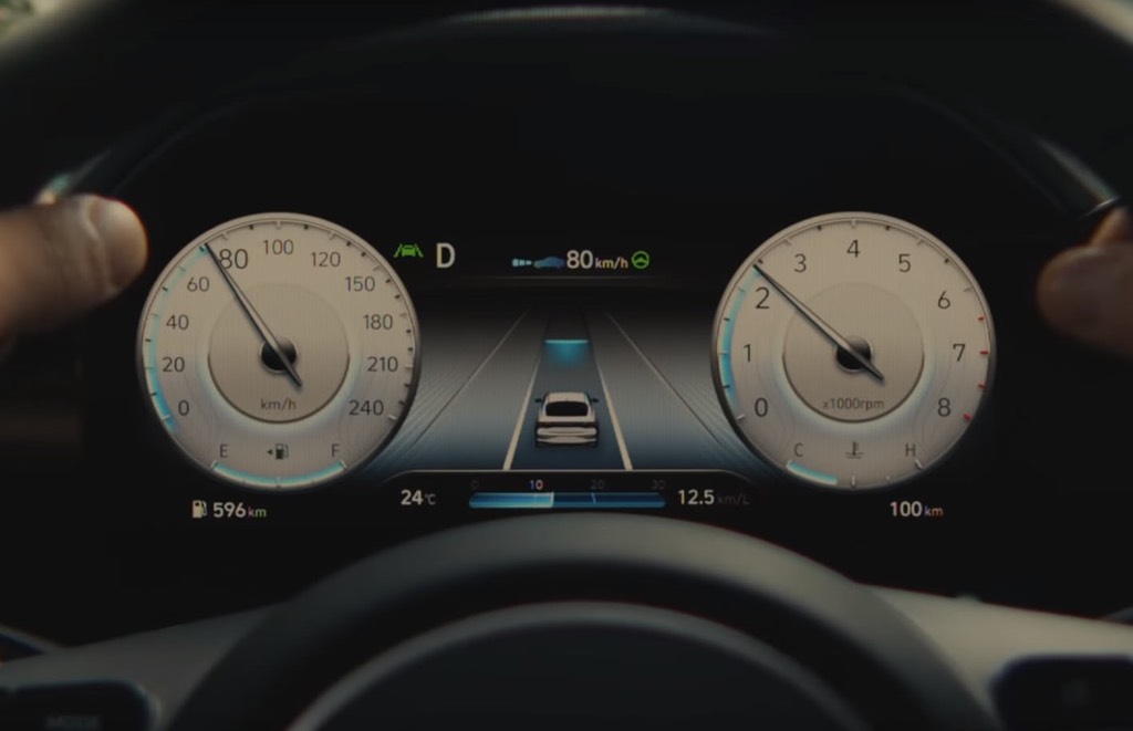 The interior is inspired by its elder sibling, the Sonata. There is a horizontal blade design on the dashboard, a new steering wheel design, all-digital instrument cluster and touchscreen infotainment system having continuity with the instrument cluster. Both are 10.25-inch screens.