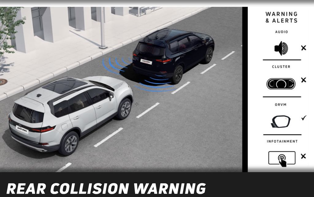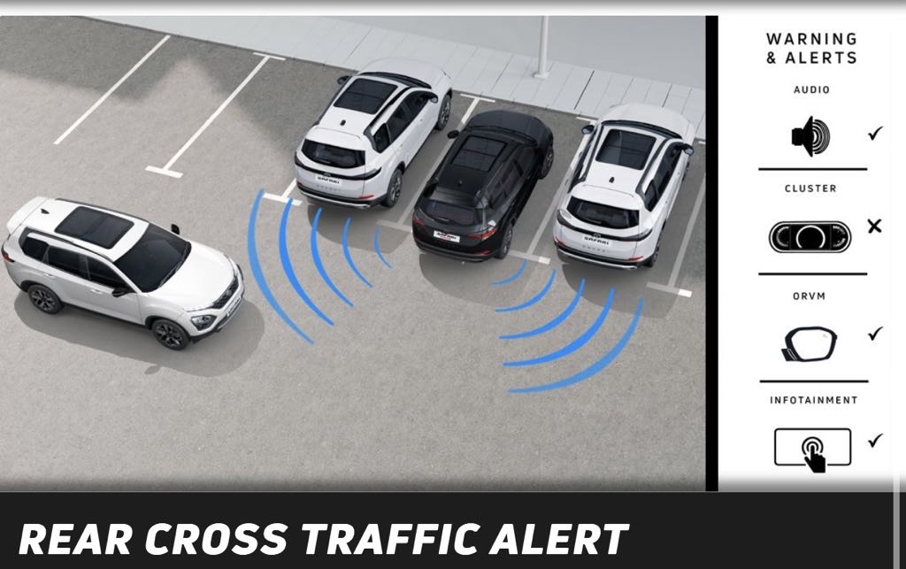 While reversing this feature alerts you if there is any object or vehicle approaching or present in the rear blind spot of the vehicle for safe reversing.