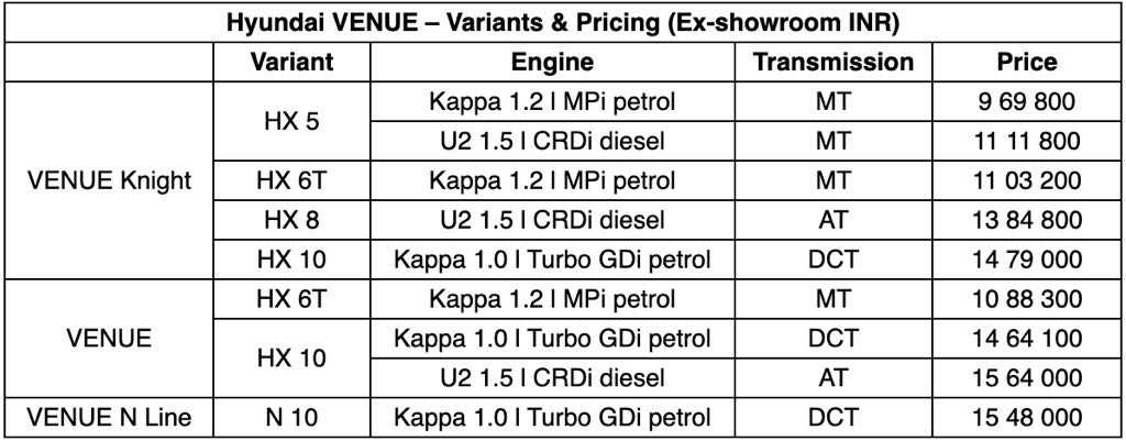 Overall, the Knight Edition adds visual differentiation to the Venue lineup without altering its core package, targeting buyers looking for a sportier aesthetic.