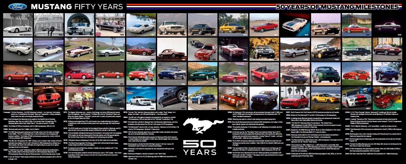 Ford also got the Boss 302 back to the Mustang stable in 2012 after a full gap of 40 years. The 2013 Mustang produces a massive 662 HP of power and it has a 5.8-litre V8 under the hood which means that the Shelby GT500 is the most powerful production V8 in the world. Lets have a look at the timeline which shows how the Mustang has evolved over the years.
