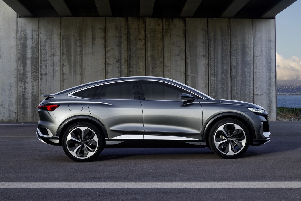 The Q4 Sportback e-tron concept is previewed with a raked windscreen, sloping roof, two-tone 22-inch alloy wheels, muscular fenders with two prominent lines on them and side skirts.