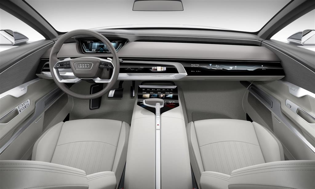 The front fascia of the Audi Prologue Coupe concept looks striking. The lines are sharp and the bumper encompasses futuristic design touches. The headlights and grille let us know that it is an Audi inspite of the fact that they too are heavily designed and made to look radically different than the current-day Audis. The side profile shows off the vehicle’s long dimensions and the alloy wheels look like sharp blade rotors that will cut through the road. The interiors of the concept too look like they have come out straight from a sci-fi movie. The steering wheel does seem to be inspired from the Mercedes S-Class though.