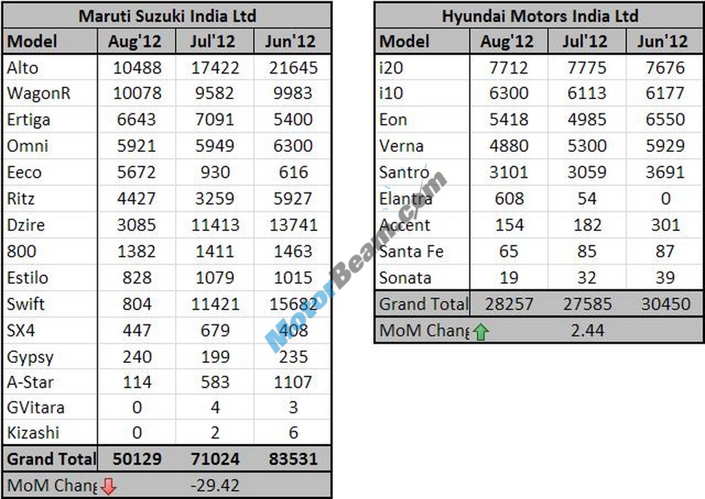 Company wise Break Up: The overall results for Maruti might be as predicted by many of us, but performance of Alto is very disappointing. With sale of 50,129 units, Maruti’s market share came down to a mere 29.2%, it is very damaging for Maruti but it was unavoidable. The impact of the lockout at Manesar is well held up by strong performance of other cars like WagonR, Ritz, Eeco and all others. The volumes brought in by other cars like Eeco looks quite doubtful and Maruti Suzuki might have managed the figures for the purpose of presentation. At the bottom of chart, devastating performance by A-Star with mere 114 units sold last month. Maruti has to buck up and get back the numbers rolling in favor of them. Hyundai at the same time is enjoying 2.44 % rise in sales. i20 is consecutively leading the sales parade for Hyundai with 7500+ units being sold consistently. Except Verna, performance from every model is good. The Verna seems to be losing out its share to UVs or to rivals.