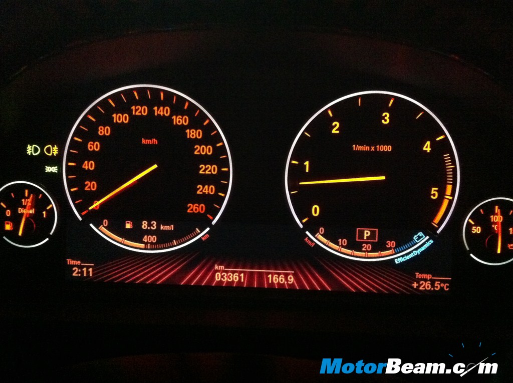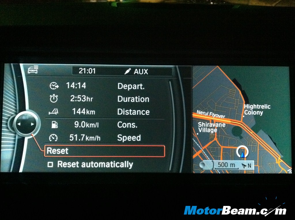The 530d features a larger 10.2 inch screen which shows various parameters. The screen also works in split screen mode, thereby showing two different groups of data in a single view as shown in the picture. The lower models get a 7 inch screen. The same also serves as the display for the rear camera and parking assist. After 144 km of rev limiter driving, the 530d returns 9 kmpl. Phenomenal.