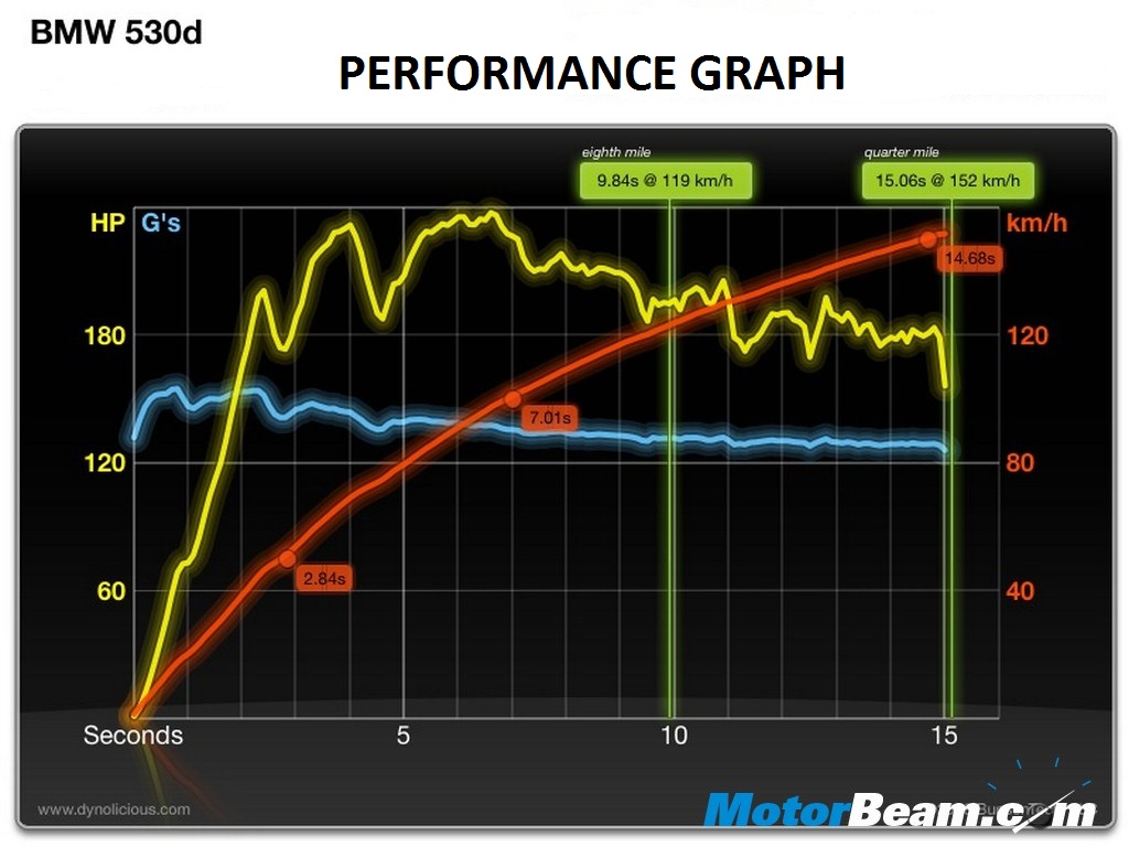 The 525d stops the clock on a 0 – 100 run in 7.2 seconds with a top speed of 236 kmph, while the 530d zooms to the same in 6.3 seconds (Official BMW timing), a full 0.9 seconds less than the 525d. Under less than ideal conditions, our test car did the same 0 – 100 run in 7.1 seconds. The paddles can soup up things nicely, downshift and floor the pedal to the metal and the 530 will dart forward like an arrow which is meant to hit the bullseye. The engine note in the process can make most heads turn and some jaws end up dropping & drooling over the sound, while the sporty looks can prove to be eye popping.