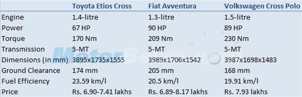 Toyota Etios Cross vs Fiat Avventura vs Volkswagen Cross Polo – Diesel Spec Comparison