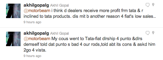 MotorBeam reader Akhil Gopal send us this tweet which summarizes it all (by the way we are on Twitter and personally reply to each and every tweet, you can tweet us here). Now with in house battle brewing at Tata Motors dealership, there is no surprise then, if a person who came with the intention of purchasing the Linea, drives out in a Tata Manza. Fiat, you need to do something and you need to do it quickly, and you need to do it right here, right now.