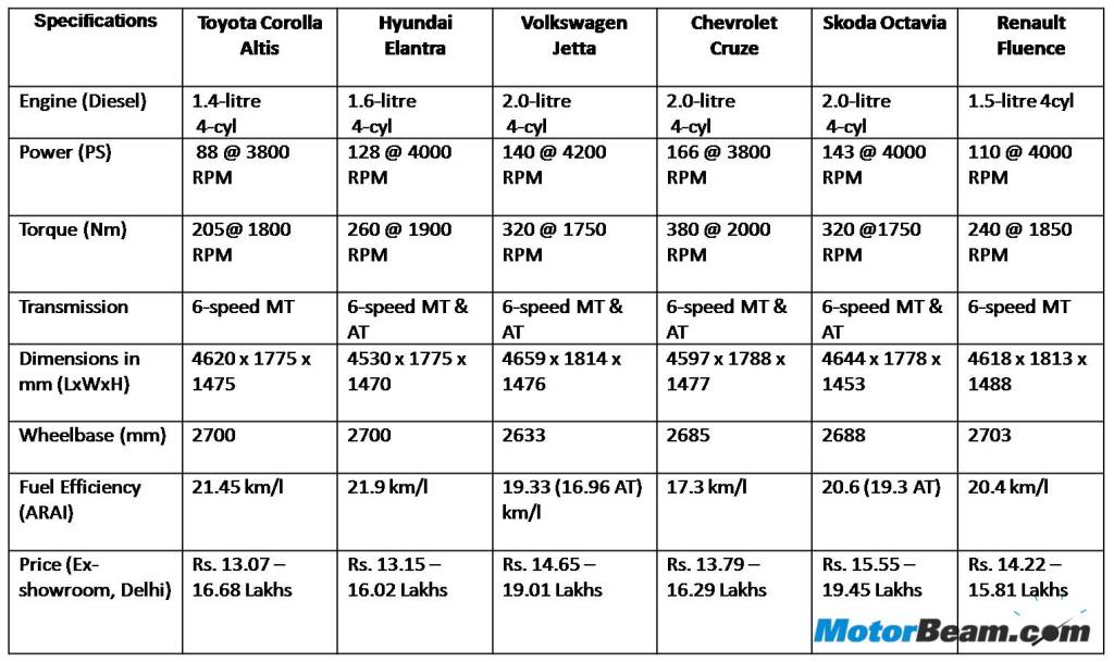 5) Price – The 2014 Corolla petrol has been priced on par with the competition, but it is the diesel that hurts the wallet. The small motor and lack of features do not justify the premium price tag. The Hyundai Elantra also comes with a small engine compared to competition but more than makes up with the features on offer. The petrol variant is certainly a value for money proposition, while the diesel model misses out in comparison to the Fluence. Certainly, the Jetta and Octavia come with a better build quality and bigger engines, but the final price difference is huge in comparison. The Cruze is also on par with the competition, but misses out on features. Unless it is only power that you crave for, the Cruze does not have much to offer.