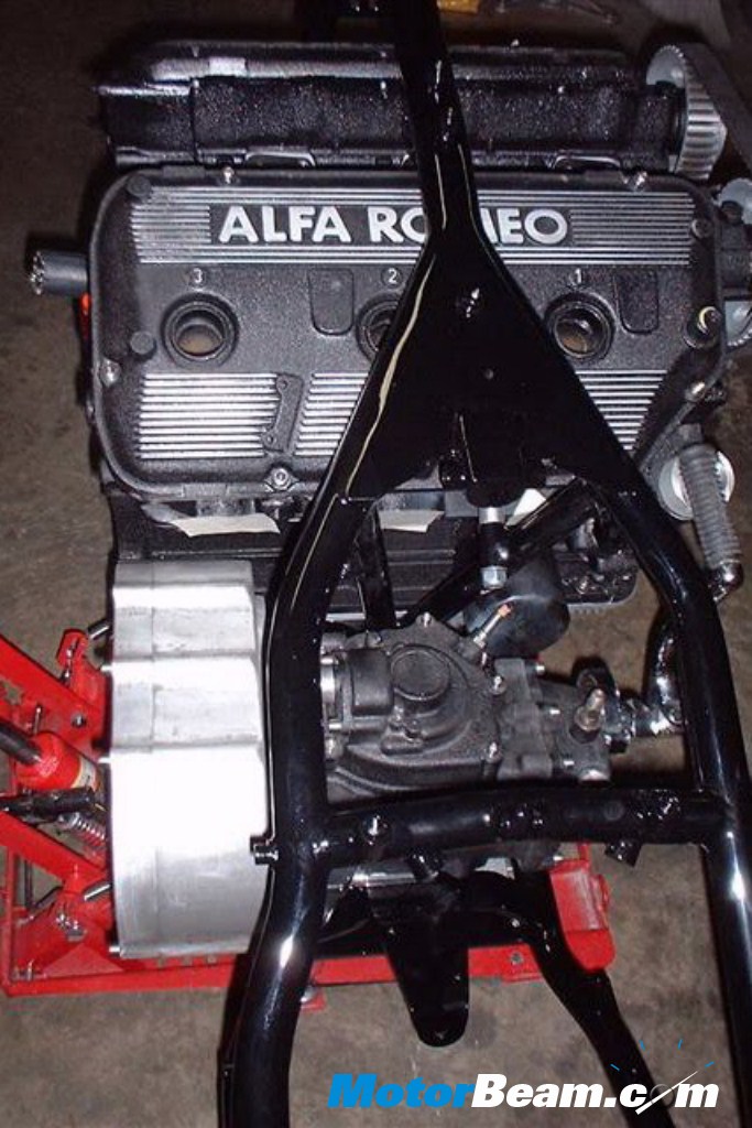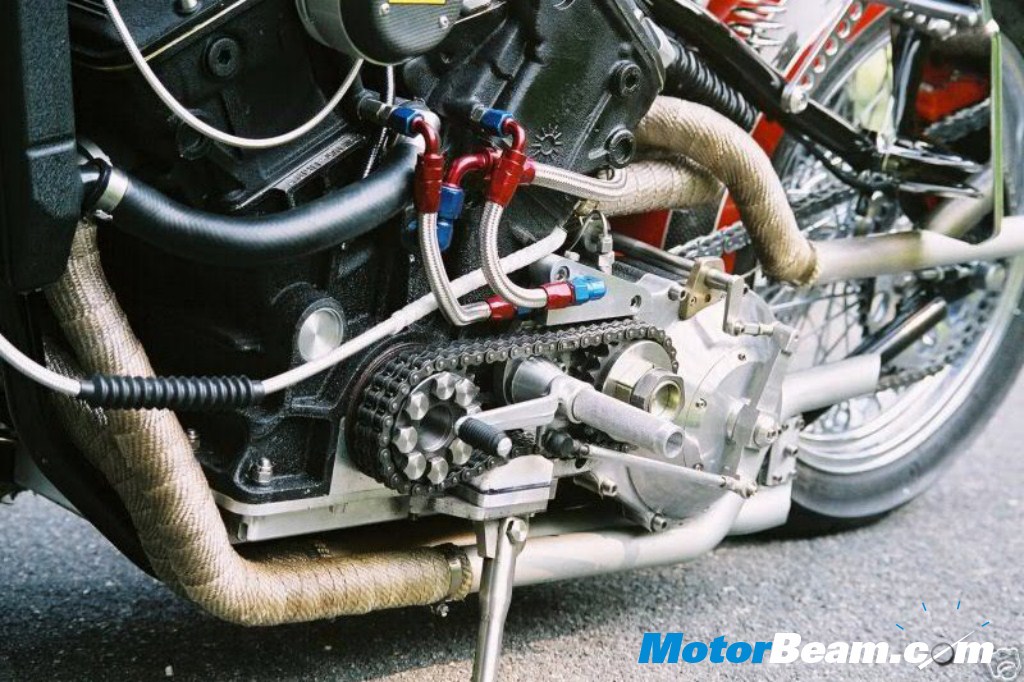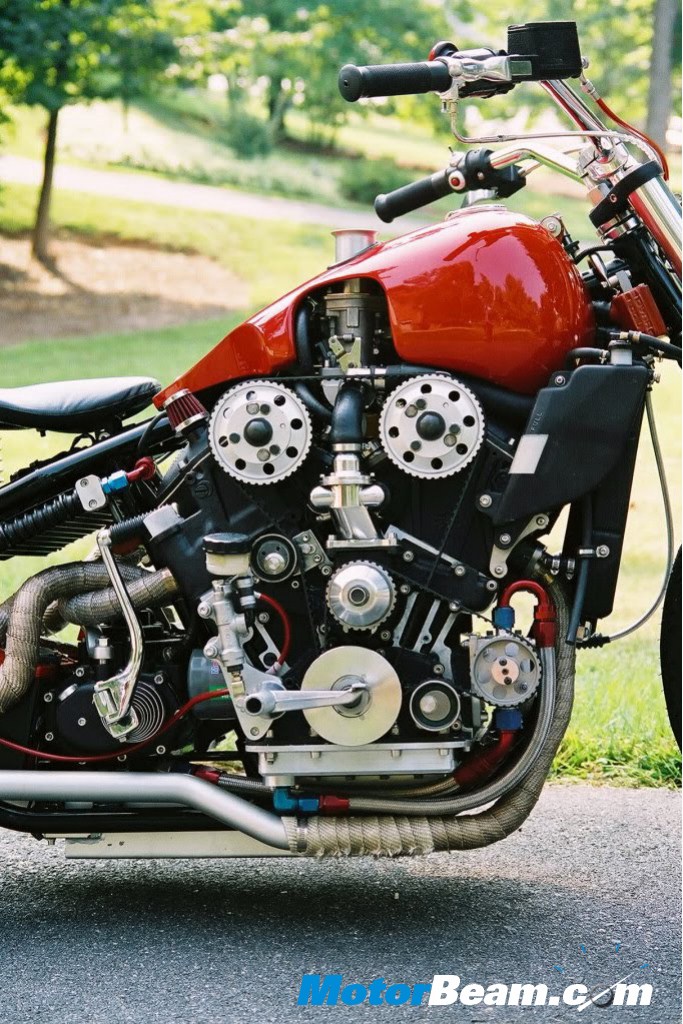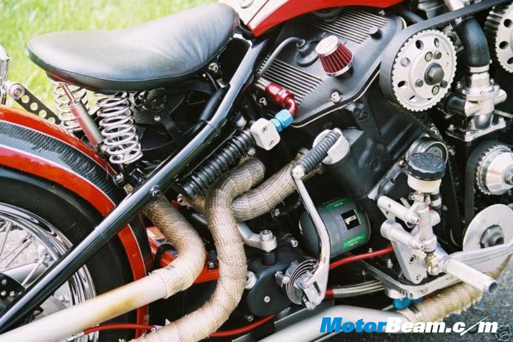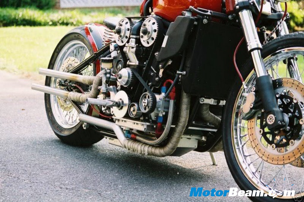 What you see above is a custom made bike powered by an Alfa Romeo 2.5 liter V6 engine with 156 horses on tap. The AlfaBeast as Chris Barber likes to call it uses a Kraftec frame with six individual exhaust pipes and Weber carburetors breathing through a set of pipes that stick out from the fuel tank. The engine is rebuilt with new bearings and rings, the tranny has new shafts, gears and bearings. Front forks, discs and calipers come from a Kawasaki ZXR750.