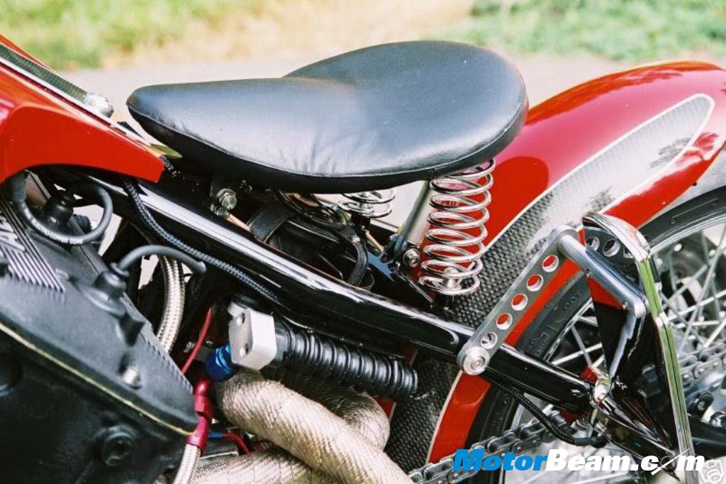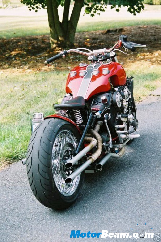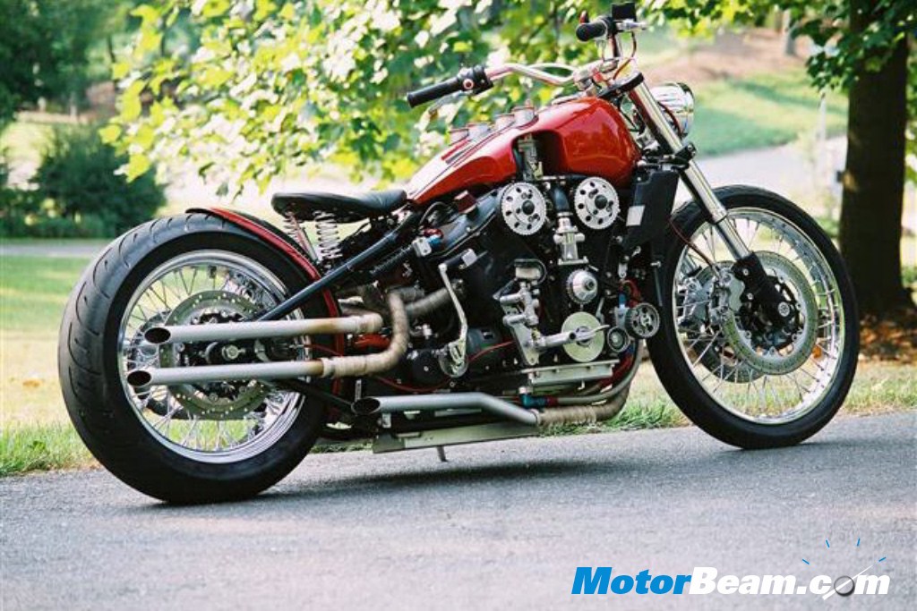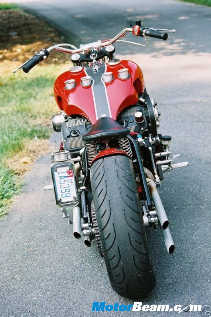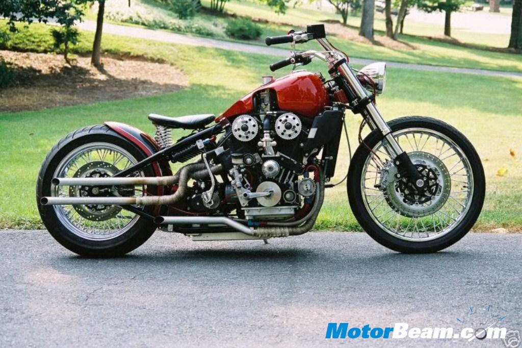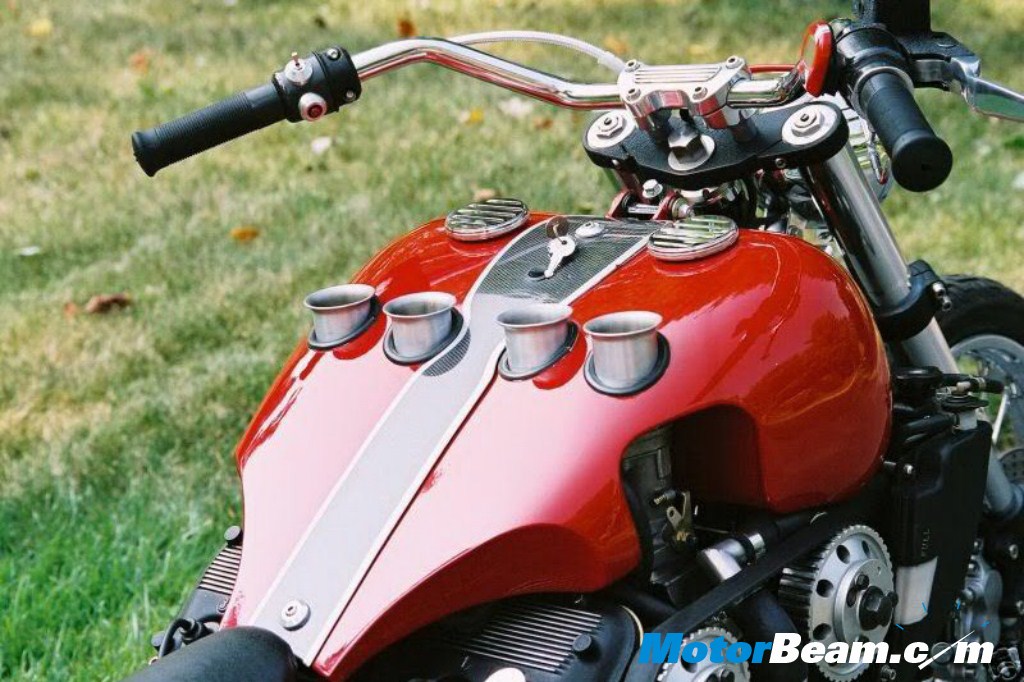 What you see above is a custom made bike powered by an Alfa Romeo 2.5 liter V6 engine with 156 horses on tap. The AlfaBeast as Chris Barber likes to call it uses a Kraftec frame with six individual exhaust pipes and Weber carburetors breathing through a set of pipes that stick out from the fuel tank. The engine is rebuilt with new bearings and rings, the tranny has new shafts, gears and bearings. Front forks, discs and calipers come from a Kawasaki ZXR750.