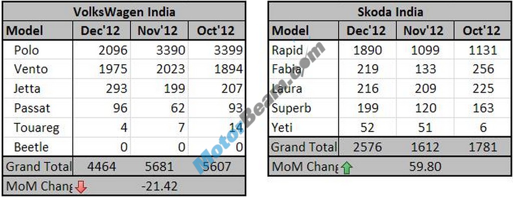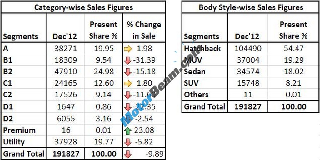 The Big Picture:– The year 2012 has ended on a sore note as December 2012 recorded the second lowest sales figures, least being in the month of August 2012. The trick of giving year end discounts and offers worked for very few companies and rest suffered very badly. Skoda recorded highest gain of 59.8% in sales while Hyundai saw the maximum drop of 23.18 % in sales in December. As always, Maruti Suzuki holds the number one position with 42.78% market share. Despite sales drop, Hyundai managed to keep the number two spot for themselves with 13.92% market share followed by Mahindra and Mahindra at number three with market share of 11.87%. This outcome was quite expected as this is the last month of year. Customers don’t want to brand their car as a ‘year old’ car for just one month. So we can say that the sales report for the month of December is ‘not so good but quite expected’.